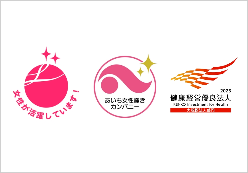 「えるぼし」、「あいち女性輝きカンパニー」などの外部認定の取得に加え、育児・介護との両立支援《育児休業取得率 女性100% 男性:51.6%(育児休業及び育児目的休暇の取得率100%)》、柔軟な働き方の推進などを通じて、社員一人ひとりの働きやすさと安心を支えています。